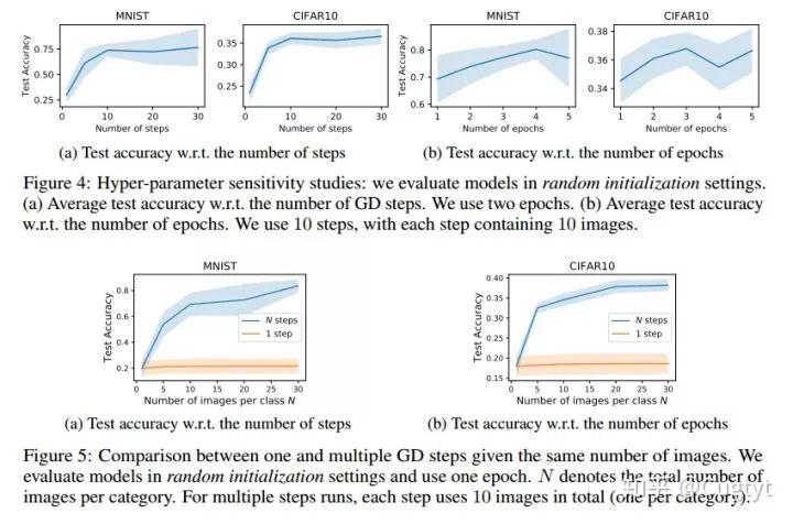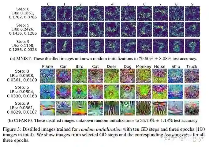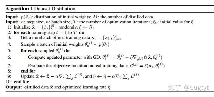 其中网络初始值θ0是从分布p(θ0)中随机采样的。在我们的优化中,蒸馏的数据对随机初始化的网络工作得也很好。算法1是我们的主要方法。在实践中,我们观察到最后的蒸馏数据在未知初始化的数据上也能工作的很好。另外,这些蒸馏图像通常看起来有一定的信息,编码了每个类别的判别特征(图3)。