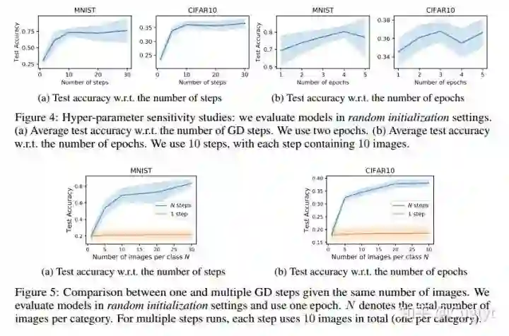 生成新的θ1作为蒸馏数据X~的函数,通过公式2生成学习率η~,然后在整个训练数据X上评估新的权重。损失L(x~,η~;θ0)对X~和η~上是可微的,可以使用标准的基于梯度的方法来优化。在很多分类任务中,数据X包含一些其他的部分,例如标签等。这种情况下,我们只把他们固定而不用学习。