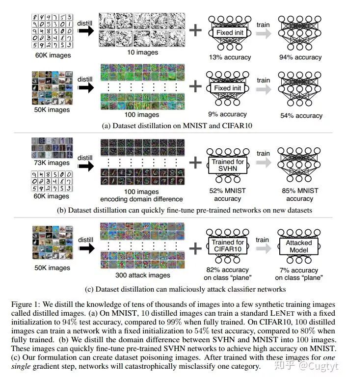 但为什么数据集蒸馏有用呢?在给定的数据集中编码多少数据,以及它的压缩性如何,这是个纯粹的科学问题。此外,与传统的常常使用数万个梯度下降步骤的训练相比,给定一些蒸馏图像,我们可以更加有效地给网络“加载”整个数据集的知识。