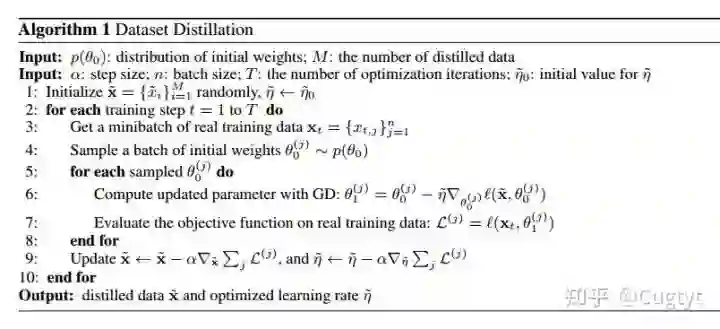 标准的训练通常是在小批量上做随机梯度下降。每一步t,一个批量数据xt={xt,j}nj=1 用于更新当前参数:此处通常要万甚至百万步来收敛。我们希望能学到一个合成的蒸馏数据x~={x~i}Mi=1 ,这里M≪N,因此一个GD步骤为: