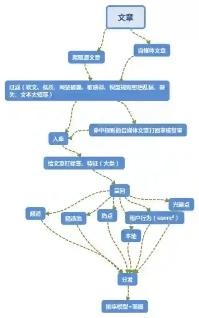 文章分为两个类型——抓取源文章(RSS)和自媒体文章。但不管什么样的文章,都需要经过反垃圾模块的过滤,去除有害政治信息、低俗内容、虚假广告、“标题党”文章等。所以,反垃圾模块里应该有这些功能。如果你问,这些功能是如何实现的,那还是前面提到的答案——输入案例或者关键词,让机器学习,找到特征并举一反三。