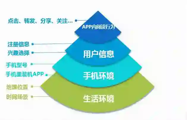 如上图展示:在用户画像中,生活环境是基础。生活环境又包括两个层次,第一是地理位置。一点资讯已经能定位到商圈和小区,而百度地图、滴滴打车已经能实时定位到你站的地方。衣食住行、水电煤气,包括政府提供的产品服务,都和你的生活环境、地理位置有关系,所以,地理位置越精准越好。
