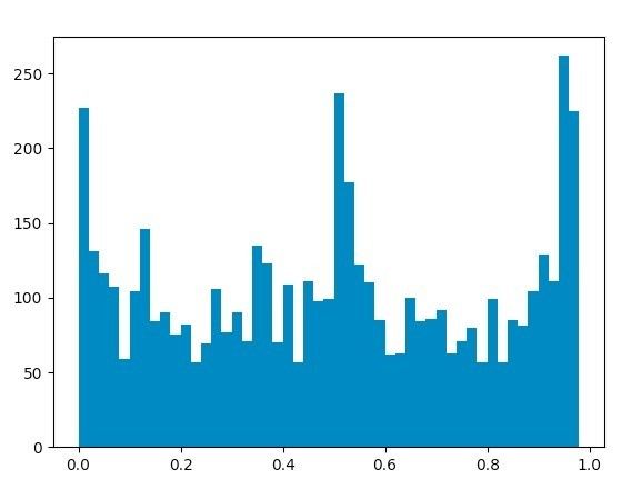 plt.hist(sentimentslist,bins=np.arange(0,1,0.02))