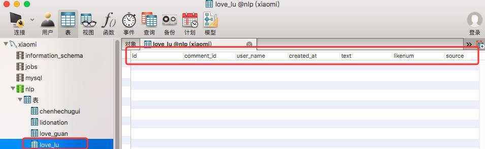 sql = "insert into nlp.love_lu(comment_id,user_name,created_at,text,likenum,source) values(%s,%s,%s,%s,%s,%s)" #格式是:数据名.表名(域名)