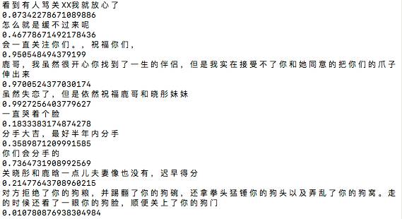 可以从文字内容和下面对应的数值看出,祝福或者表现的积极的情绪,分值大多高于 0.5,而期盼分手或者表达消极情绪的分值,大多低于 0.5。分析结果中也存在一定的误差,可以通过训练对算法进行优化,米酱语文不好就不瞎搞了…(逃