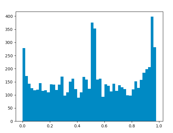 对上节经过处理得到的情感值列表进行统计,并生成分布图。下图数据采集时间 10 月 9 日 19 时,采集评论 1w 条。