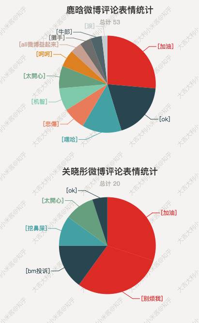给鹿晗的评论中表情的数量是关晓彤的近 3 倍,而排在第一位的,都是 [加油],可以看到粉丝们对鹿晗的恋情还是支持居多的,当然也不乏有些人想要 [bm投诉] 主角们了,也有部分人感到 [悲伤],想要冷静一下 [别烦我]。