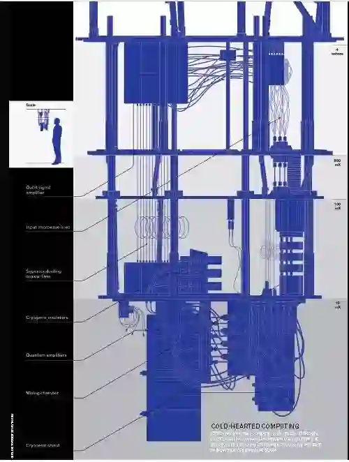 图1:IBM和Google 的量子计算机需要冷却到接近绝对零度才能工作,此冷却是用一个稀释冰箱。下面是其框图。