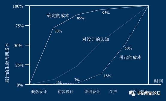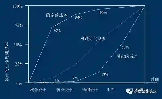 如图2所示,是一份关于生命周期内的成本的累计曲线,它所描述的是在任何工作的初始阶段就基本锁定了未来目标结果的主体成本,即越前期思考问题并纠正,影响到的未来成本虽然会很高,但实际引起的纠正成本却很低,越后期发现问题,引起纠正的成本越高,决策成本也会越来越高。这个思路也适用于企业中任何的业务环节的不同业务阶段。
