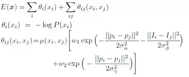 对于第二项,θij,它是一个滤波器。当xi != xj时,μ= 1。当xi = xj时,μ= 0。在括号中,它是两个内核的加权和。第一个核取决于像素值差和像素位置差,这是一种双边的filter。双边滤波器具有保留边缘的特性。第二个内核仅取决于像素位置差异,这是一个高斯滤波器。那些σ和w,通过交叉验证找到。迭代次数为10。