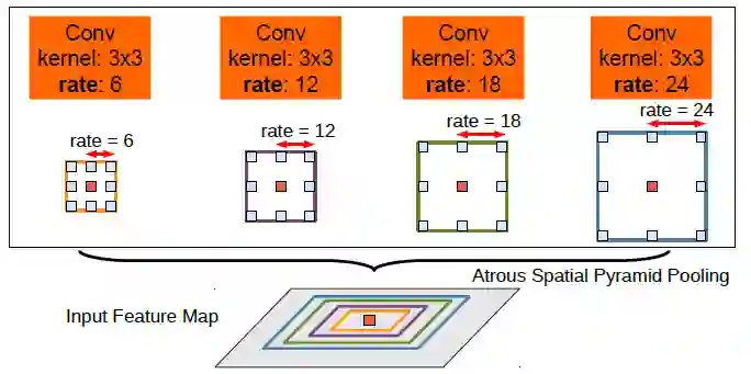 ASPP实际上是空间金字塔池的一个版本,其中的概念已经在SPPNet中描述。在ASPP中,在输入特征映射中应用不同速率的并行空洞卷积,并融合在一起。