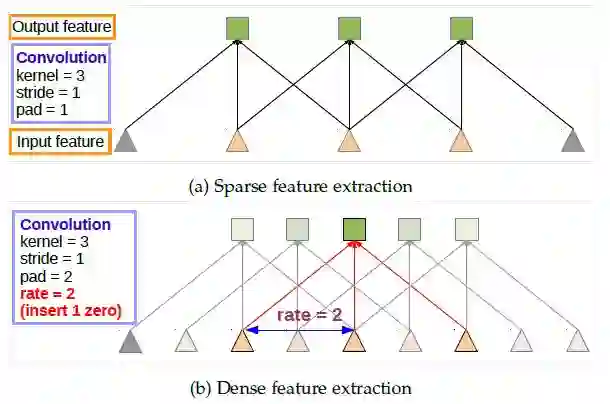 在图的底部,它是一个空洞卷积。我们可以看到,当rate = 2时,输入信号被交替采样。首先,pad = 2 意味着我们在左侧和右侧填充2个零。然后,在 rate = 2的情况下,我们有每2个输入就对输入信号进行采样以进行卷积。因此,在输出端,我们将有5个输出,这使得输出的特征图增大。