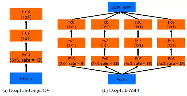 DeepLab-LargeFOV(左:即仅单个atrous conv),DeepLab-ASPP(右,即ASPP)