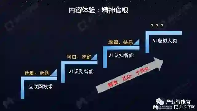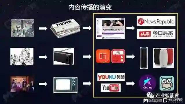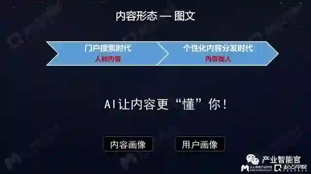 AI技术兴起后,机器对内容进行学习、有了更多理解,现在变成了“内容找人”——今日头条用多了以后,你会发现看到的都是你喜欢的内容,都是某些品类的文章。而这都是靠机器学习、AI这些技术驱动。内容本身好像具备了思想,它知道人在关心什么、想知道什么;通过技术驱动让内容本身更懂得用户的兴趣爱好。