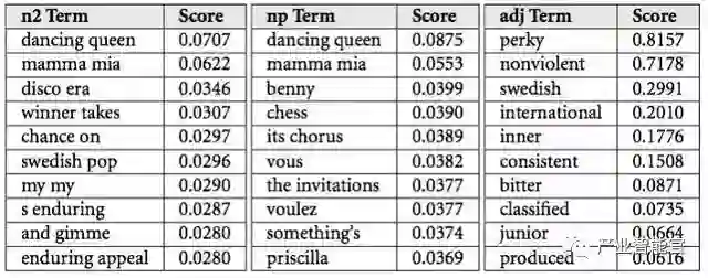 虽然我不知道Spotify如何处理他们的抓取数据,但可以通过Echo Nest去进行分析理解。Echo Nest是Spotify在2014年收购的一家音乐分析公司。这部分用到的术语被称为文化向量(cultural vectors)或顶级形容词(top terms)。每个歌星和歌曲都有成千上万的不断变化的顶级形容词。每一个形容词都有一个相关的权重,这反映了它的重要性(简单来说,一个人会用这个词来形容音乐的可能性)。