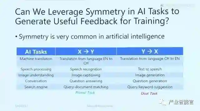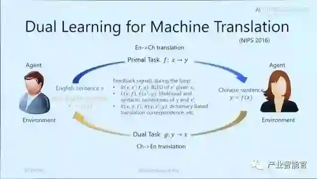 很多人工智能的应用涉及两个互为对偶的任务。例如,机器翻译中从中文到英文翻译和从英文到中文的翻译互为对偶,语音处理中语音识别和语音合成互为对偶,图像理解中基于图像生成文本和基于文本生成图像互为对偶等等。这些互为对偶的任务可以形成一个闭环,使从没有标注的数据中进行学习成为可能。