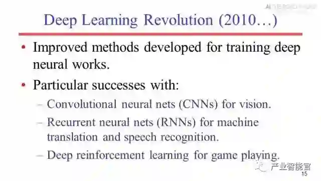 2010年以后,随着更好的深度神经网络训练方法的提出,神经网络又卷土重来。深度学习“革命”,Raymond用“革命”一词来形容深度学习的影响之大。深度学习在几大方面取得了成功,包括计算机视觉(主要归功于卷积神经网络CNNs)、机器翻译和语音识别(主要归功于循环神经网络RNNs)以及视频和棋牌游戏(得益于深度强化学习)。