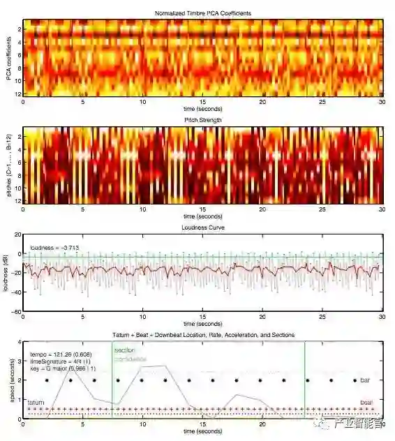 经过这个过程,神经网络就能对歌曲有所了解,包括时长、节奏、风格、音量、音调等特征。下面是 Daft Punk 的《Around the World》30 秒钟片段的分析示例。