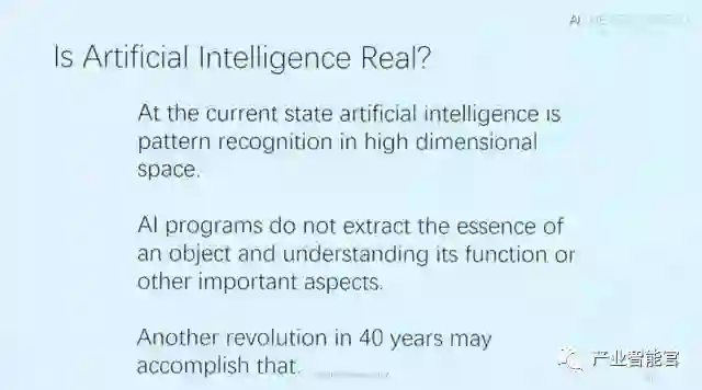 最后John提出了一个问题:人工智能是真的吗?他认为,现在的人工智能只是高维空间中的模式识别,AI还不能提取出一个事物的本质或者理解它的功能。在John看来,要想实现这一点,只是需要另外40年的时间。