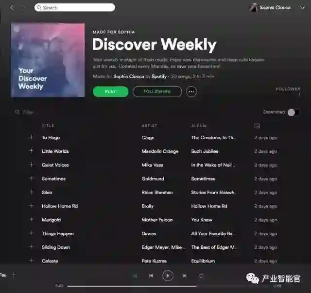 每到周一的时候,就会有超过1亿的Spotify用户发现,应用中会有一个新的播放列表等待着他们。这里面包含有Spotify(准确来说是Spotify的人工智能技术)为用户“定制”的、以前从未听过的,但很可能会喜欢的30首歌曲。它的名字叫Discover Weekly,它非常神奇。