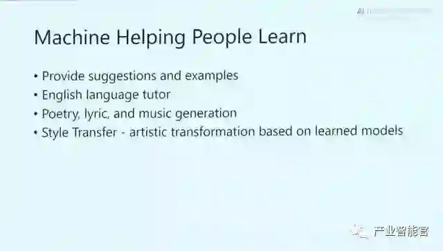 洪小文博士表示机器还可以在多方面帮助人们学习,例如提供学习建议和案例,作为语言学习的辅助手段。AI还可以有艺术创造力:创作诗歌、歌词以及音乐,对图片进行风格转换等。