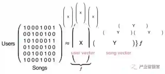 当它结束时,我们会得到两种类型的向量,这里用X和Y表示。X是一个用户矢量(user vector),代表一个用户的喜好,而Y是一个歌曲矢量(song vector),代表了一首歌的特征。