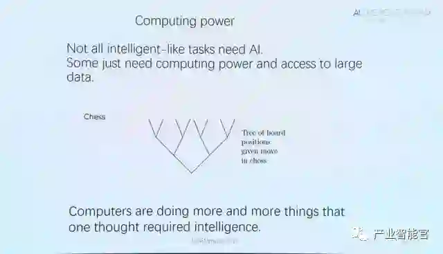 他还说到,其实很多现在看来是智能的任务其实都不是AI,有些只需要强大的计算以及大数据就足够了,例如棋类比赛。计算机正在做越来越多的人们以为需要智能的事情,实际上有些并不是AI。所以我们在从事人工智能相关的工作时要想一想,这个问题的核心的是AI吗?还是仅仅需要大计算而已?