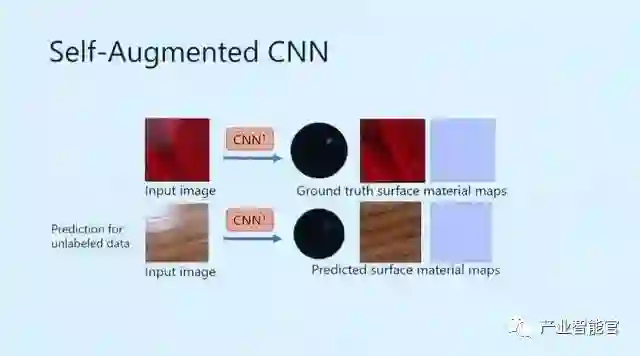 当然,由于现在CNN还没有训练好,测试结果肯定不能作为正确的标定用来训练。但是,我们对材质属性估计这个问题的逆问题,具有完整的知识。因此,可以用这个中间测试结果得到的材质属性,配合现有的材质渲染程序,生成一个当前中间结果的材质属性和其对应的渲染结果(照片)的数据对,这一数据对是完好保持纹理照片和纹理属性这一对应关系的“正确标定数据对”,因此我们就可以放心地利用这一自增强出来的数据来进行训练。