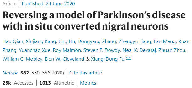 “2020年6月24日,加州大学圣地亚哥分校付向东团队在Nature 发表题为:Reversing a model of Parkinson’s disease with in situconverted nigral neurons 的研究论文。”