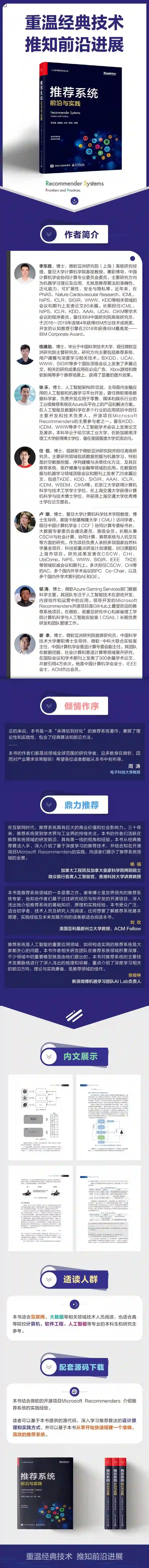 本书作者李东胜、练建勋、张乐、任侃、卢暾、邬涛、谢幸长期活跃在推荐系统研发一线,在推荐系统领域的权威会议和期刊上发表过数百篇有影响力的学术论文,主持开发包括Microsoft Recommenders在内的多个成功推荐系统项目。