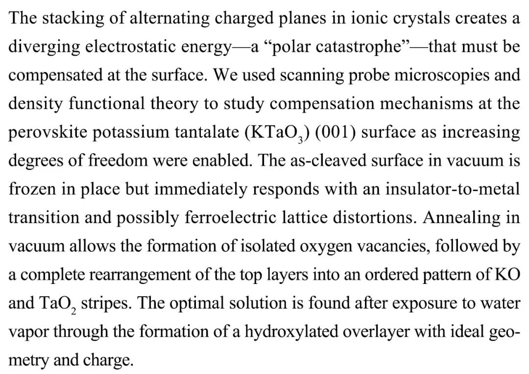 (导读 卓思琪)离子晶体中交替带电的平面堆叠会产生发散的静电能(极性激变),带来不稳定性,因此它必须通过表面重构得到补偿。本文研究了钙钛矿钽酸钾 KTaO3 (001) 表面的补偿机制。切割的表面被冷冻并固定在真空中,升温后能立即做出从绝缘体转变为金属的响应,并且可能产生铁电晶格变形。真空中退火会形成氧空缺,而后表面顶层重排形成有序的 KO 和 TaO2 条纹。最优方案是将表面暴露于水蒸气中,形成具有理想几何形状和电荷的羟基化覆盖层。
