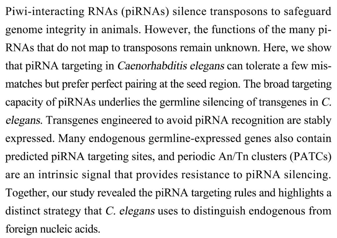 (导读 郭怿暄)piRNA 沉默转座子从而保护动物基因组稳定性,但非转座子定位的 piRNA 功能尚不清楚。本研究发现线虫中 piRNA 靶向规则:种子序列倾向完全匹配,其它区域允许少量不匹配。利用这一规则设计出避免 piRNA 识别且稳定表达的转基因。许多內源生殖系表达基因同样具有 piRNA 靶向位点,但其內源周期性 An/Tn 簇(PATCs)信号可对 piRNA 沉默产生抵抗,从而区分内源外源核苷酸序列。