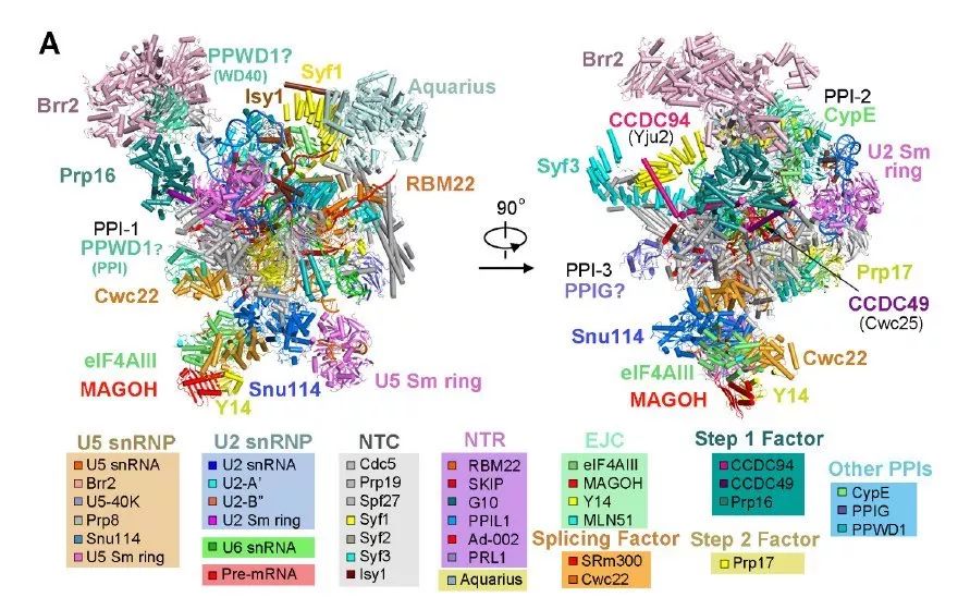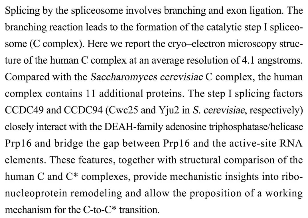 (导读 郭怿暄)剪切体对 mRNA 的剪切涉及分支和外显子连接两个步骤,分支反应中催化第一步剪切体(C 复合体)形成。本研究解析了人类 C 复合体的冷冻电镜结构,它与酵母 C 复合体相比包含额外 11 个蛋白质。第一步剪切因子 CCDC49 和 CCDC94 与解旋酶 Prp16 的相互作用可帮助 Prp16 与 RNA 元件接触。这一结构为了解核糖核蛋白重塑及人类 C 复合体向 C* 复合体转换机制奠定基础。