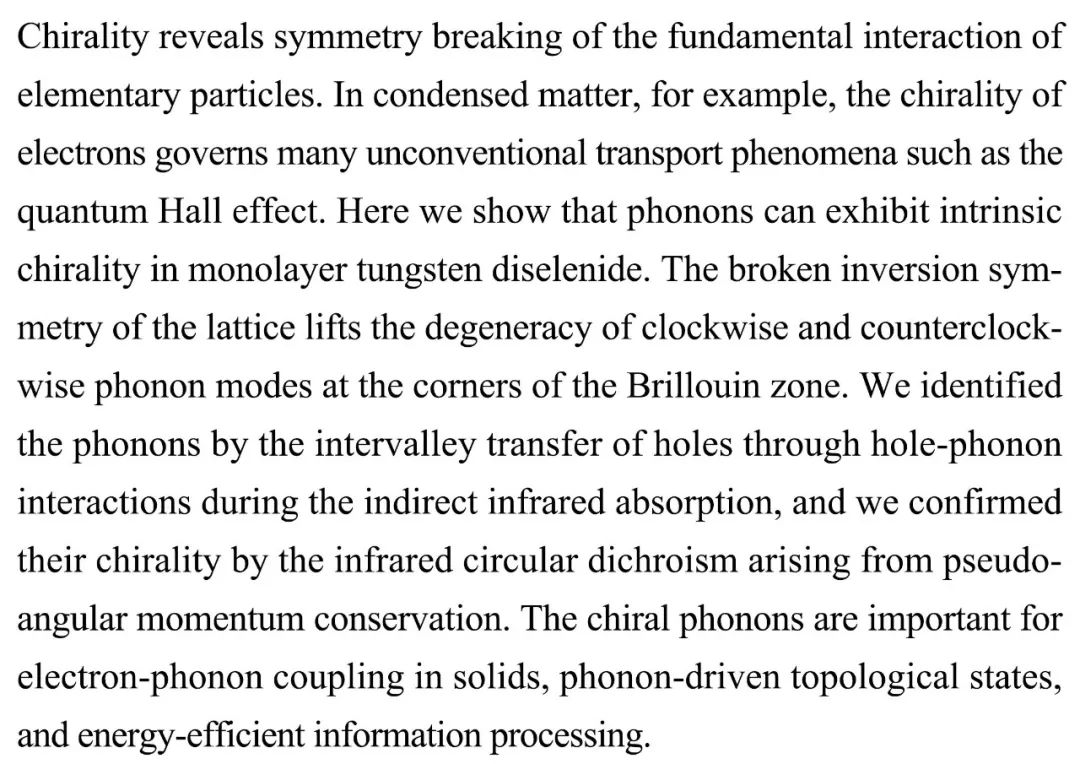 (导读 阿金)手性揭示基本粒子相互作用的对称破缺。本研究展示了单层二硒化钨中的声子存在内在手性,在间接红外吸收过程中通过空穴-声子相互作用的空穴谷间传输确定声子,通过赝角动量守恒产生的红外圆二色谱确认它们的手性。研究结果对处理固体中电子声子耦合、高能效信息处理等非常重要。