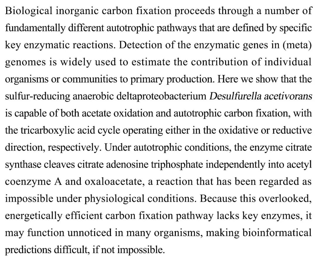 (导读 郭思瑶)生物无机碳固定通过多个关键酶反应完成。 科学家发现降硫厌氧变形菌 Desulfurella acetivorans 能够从氧化或还原两个方向进行自养碳固定。自养条件下,柠檬酸合酶将柠檬酸腺苷三磷酸分解为乙酰辅酶 A 和草酰乙酸盐,这个反应长期被认为在生理条件是无法发生的。该研究揭示了一条长期被忽略的碳固定通路。