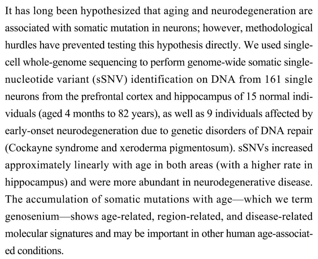 (导读 柳寒石)本文利用全细胞基因组测序技术分别鉴定了来自正常和早发型神经退行性疾病个体的 161 个前额叶皮层和海马的单个神经元中的单核苷酸变异(sSNV),发现在这两个区域中 sSNVs 几乎随着年龄增加而呈现线性增加,并且在神经退行性疾病中有更高的丰度。这表明随着年龄增加的体细胞突变积累可以作为指示人类年龄相关疾病的分子标记。