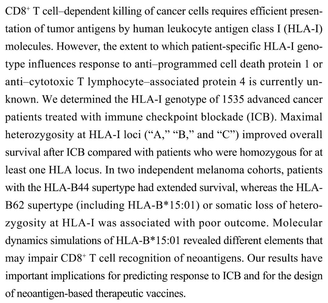 患者特异性人类白细胞抗原 I 类(HLA-I)基因类型影响癌症对免疫检查点抑制治疗(ICB)的响应程度