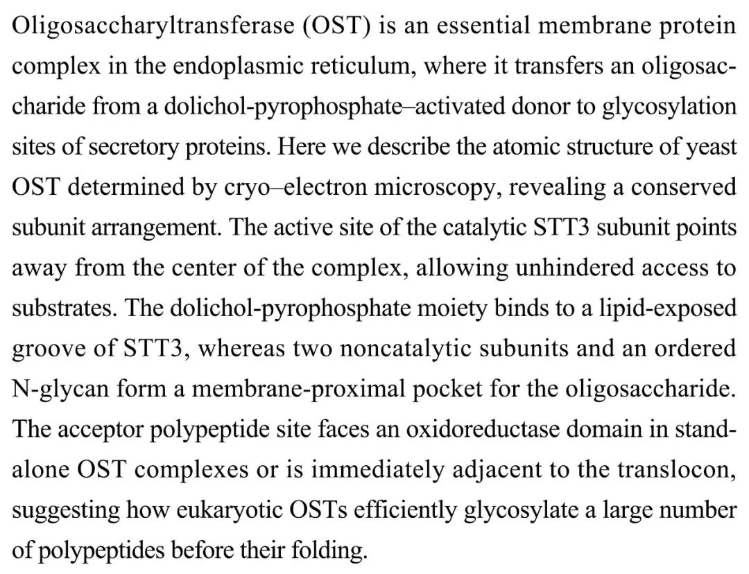 酵母寡糖转移酶(OST)复合物结构帮助理解真核 N-糖基化