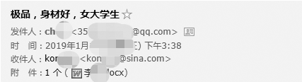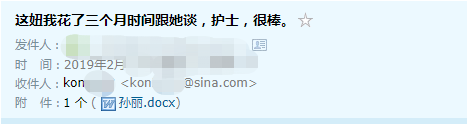 我在他邮箱里看到最近三个月频繁给一个名:kon***@sina.com的新浪邮箱发邮件,而每封邮件里都有一个附件,打开附件的Word文档全是某个女生的个人信息,包括照片,姓名,身份,毕业学校,兴趣爱好,父母家人等非常详细的信息。