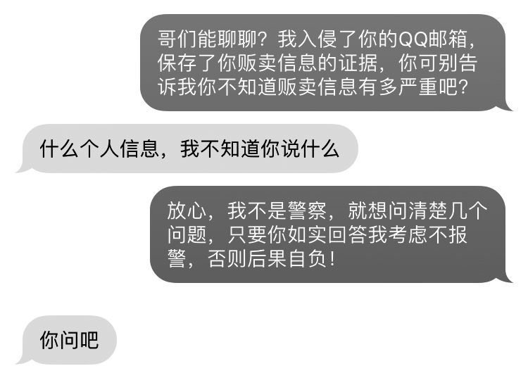 我保留了他贩卖信息的证据后,选择跟他聊一聊,换了张不记名的电话卡之后,给他打了个电话,但一直不肯接,要么就是直接挂断了,打了五六个我给他编辑了条短信。