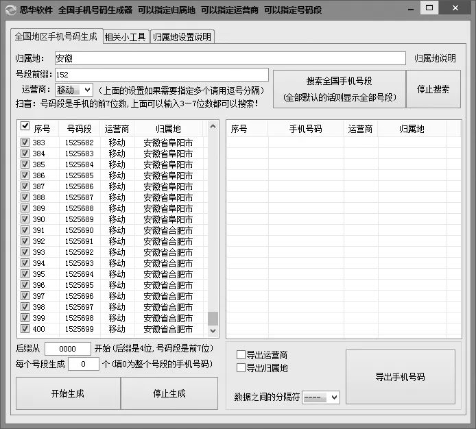 手机号的结构是前三位+四位归属地+随机位,我在网上找了一个全国号码生成器查找安徽移动所有的开头为152的号码,一共有400个