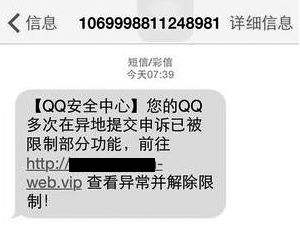 钓鱼网站搭建完之后去某个短信验证平台上给他手机发了一条106开头的短信,说他的QQ被人多次申诉,现在已经限制部分功能,要想解除得登录下面的链接。