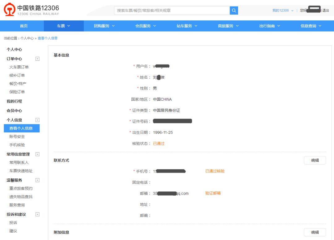 我并没有停止撞库攻击,尝试登陆他的12306帐号,嚯!没想到这厮连那么重要的网站都用同一个密码,赶紧点开个人信息查看。
