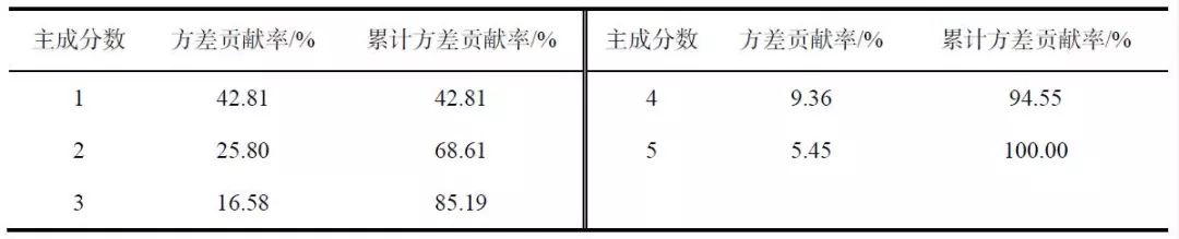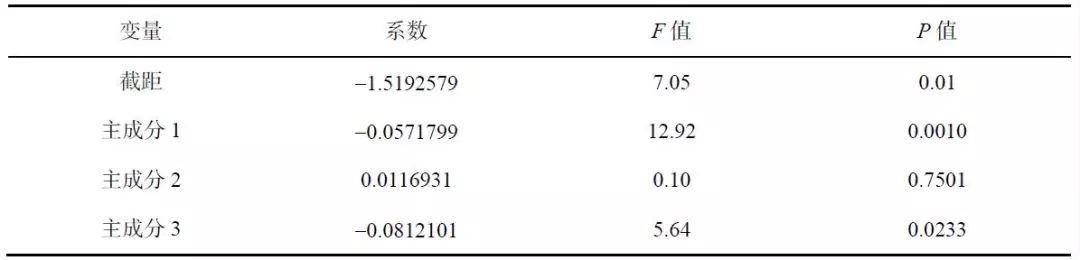 将筛选出来的5 个指标进行主成分分析(表3)。通过主成分分析发现,前3 个主成分的累计贡献率为85.19%,故前3 个主成分可以表达原来主成分的信息,由原来的5 个指标转化为3 个新指标,起到了降维的作用。通过SAS输出前6 个主成分的特征向量(这里不列出),得出前3 个主成分与各个指标之间的线性关系,采用各个主成分与各个自变量之间的关系式计算各个主成分得分。