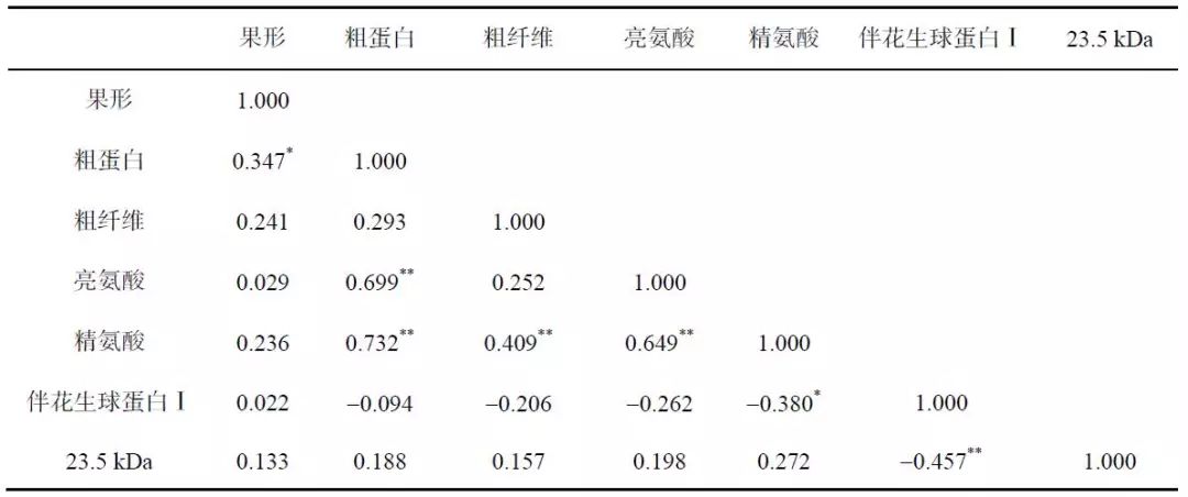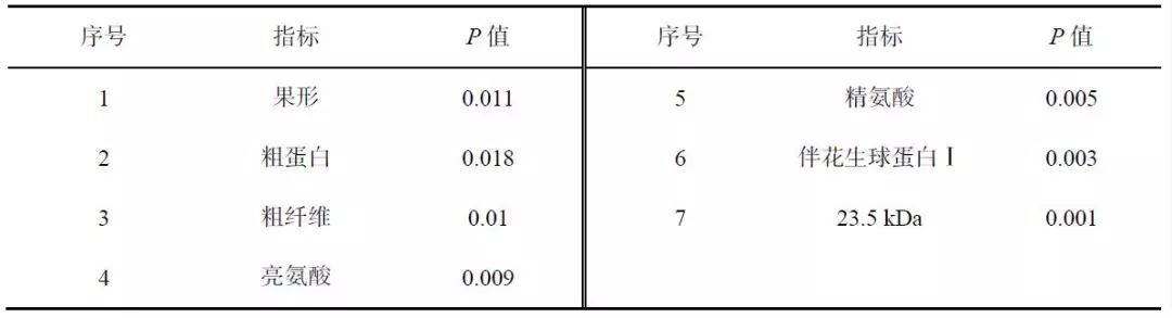 将筛选出来的7 个品质指标进行相关性分析(表2),对于在0.01 水平上显著、相关系数大于0.600 的指标,用其中一个指标表示另外一个指标,故保留的指标为果形、粗蛋白、精氨酸、伴花生球蛋白Ⅰ和23.5 kDa 蛋白质亚基。
