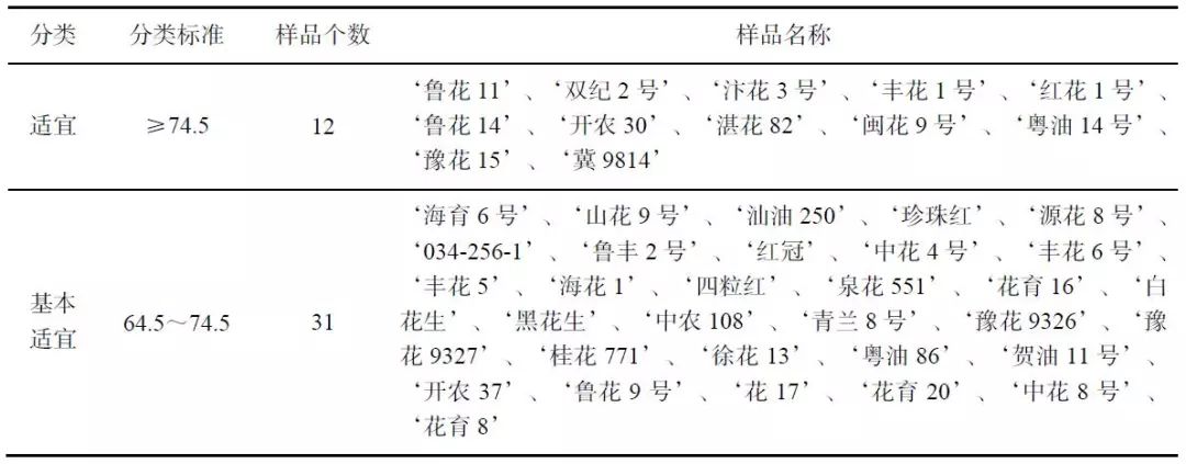 以各性状指标得分之和作为各品种资源的最终得分,将各个品种最终得分分为3 类,即Ⅰ级(适宜)、Ⅱ级(基本适宜)、Ⅲ级(不适宜),Ⅰ级、Ⅱ级品种见表8。比较分析发现适宜准确率为91.7%,基本适宜准确率为90.3%,结果较好。