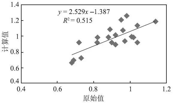 为了考察建立模型的准确性及推广适用性,采用剩余的21 个品种进行模型的验证。离群点分析发现,‘花冠王’的凝胶性为离群点,将其删除。将20 个花生品种的果形、粗蛋白精氨酸、伴花生球蛋白Ⅰ、23.5 kDa 5 个指标代入公式,计算20 个品种的凝胶性,并将模型计算结果与凝胶性综合值进行回归分析,二者的相关系数R 为0.718(图1)。