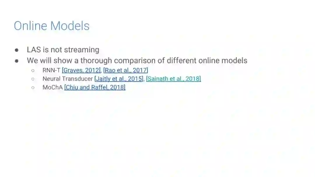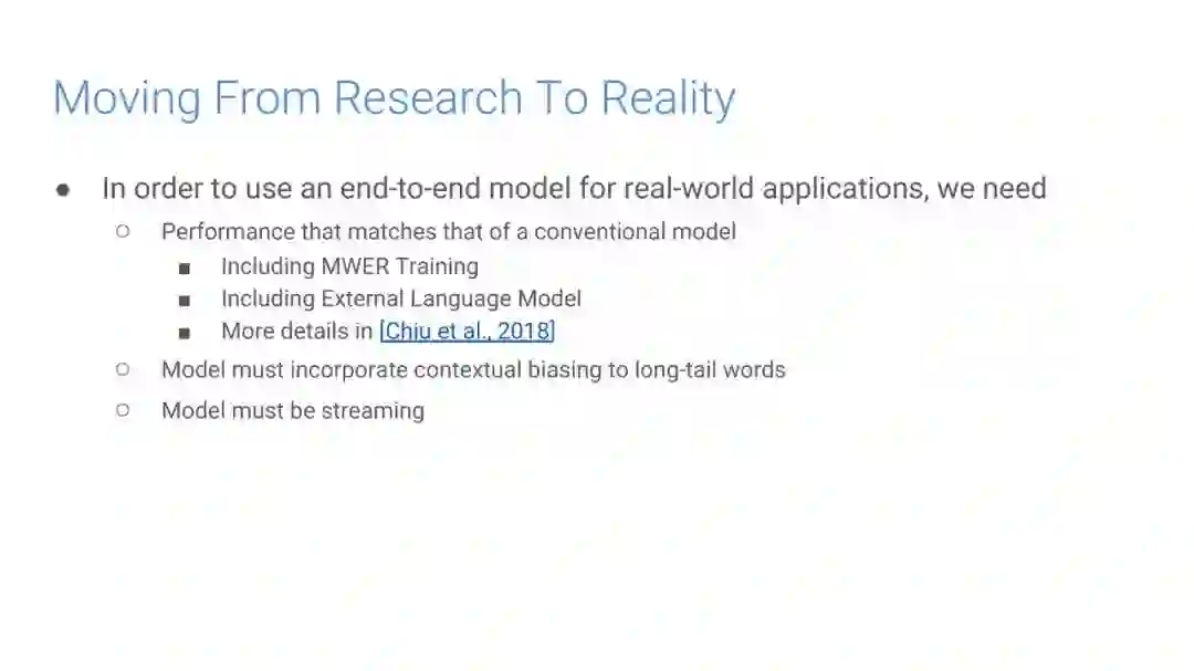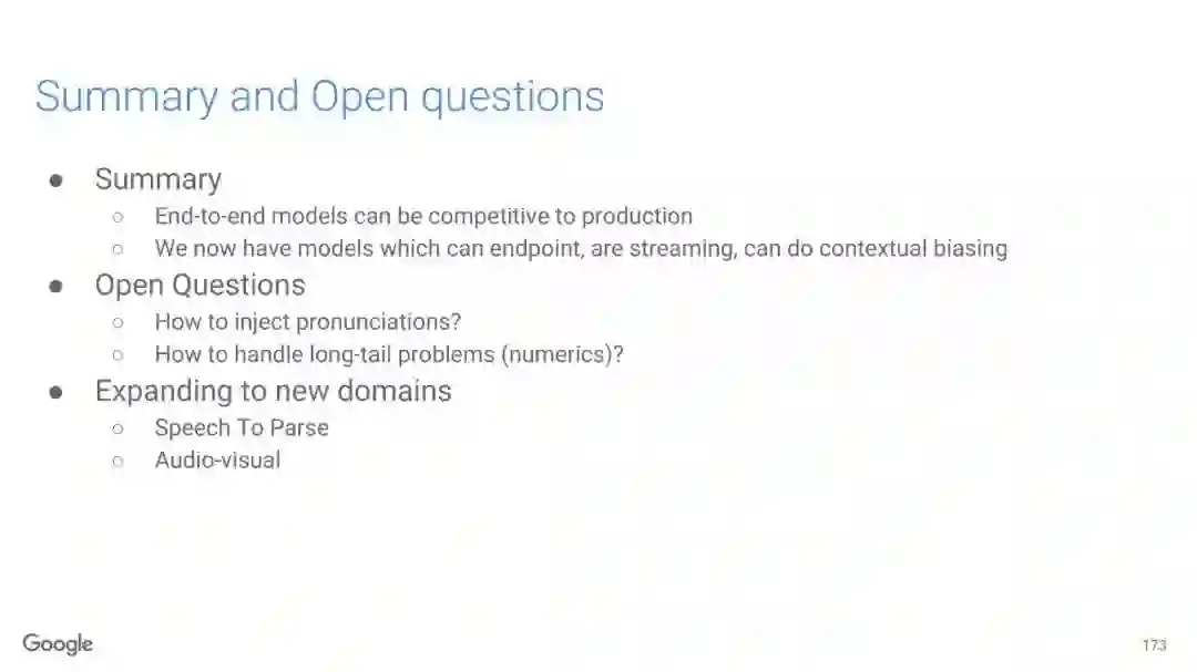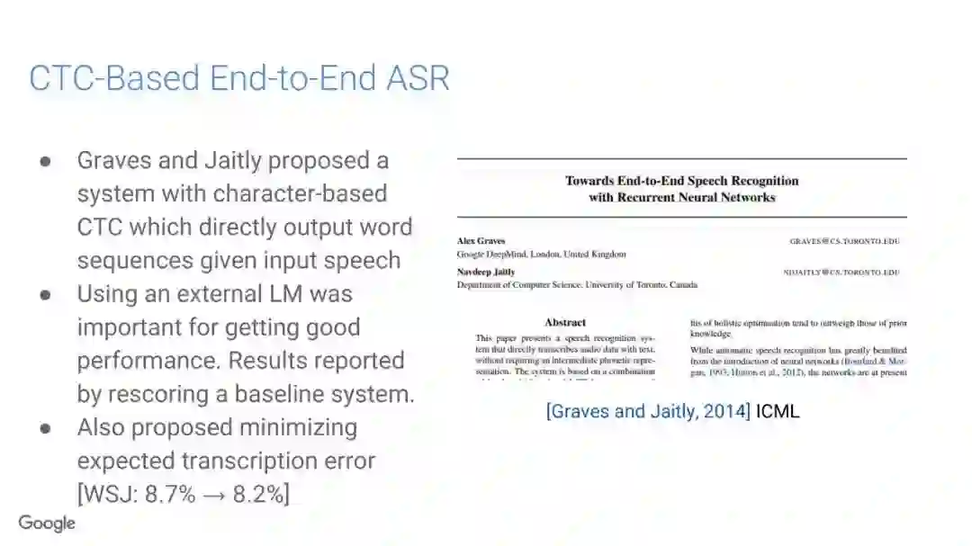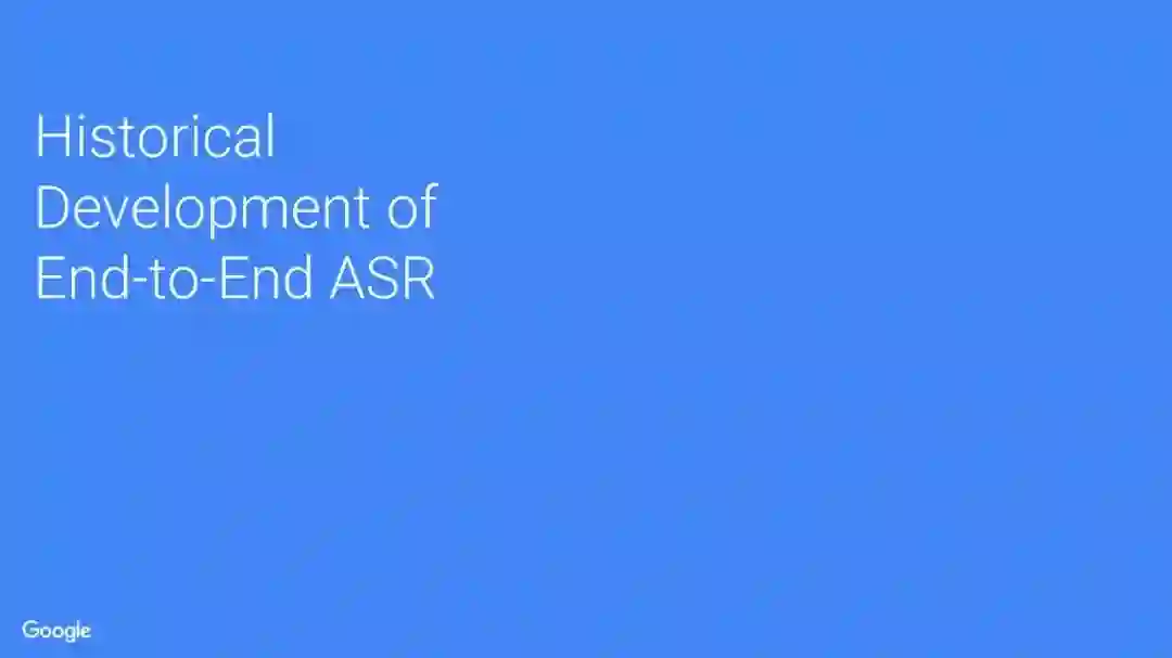 在本教程中,我们将详细介绍自动语音识别中的端到端建模方案,从这些系统的历史发展开始,同时分析这些方法的共性和区别;进而,我们将讨论一些最近的创新工作,这些创新极大地改进了端到端模型的性能,使它们能够超过传统的自动语音识别系统的性能;然后,本教程将描述这项研究的一些令人兴奋的应用,以及一些可能的研究方向;最终,我们将讨论端到端模型现在存在的问题,以及将来所面临的挑战。