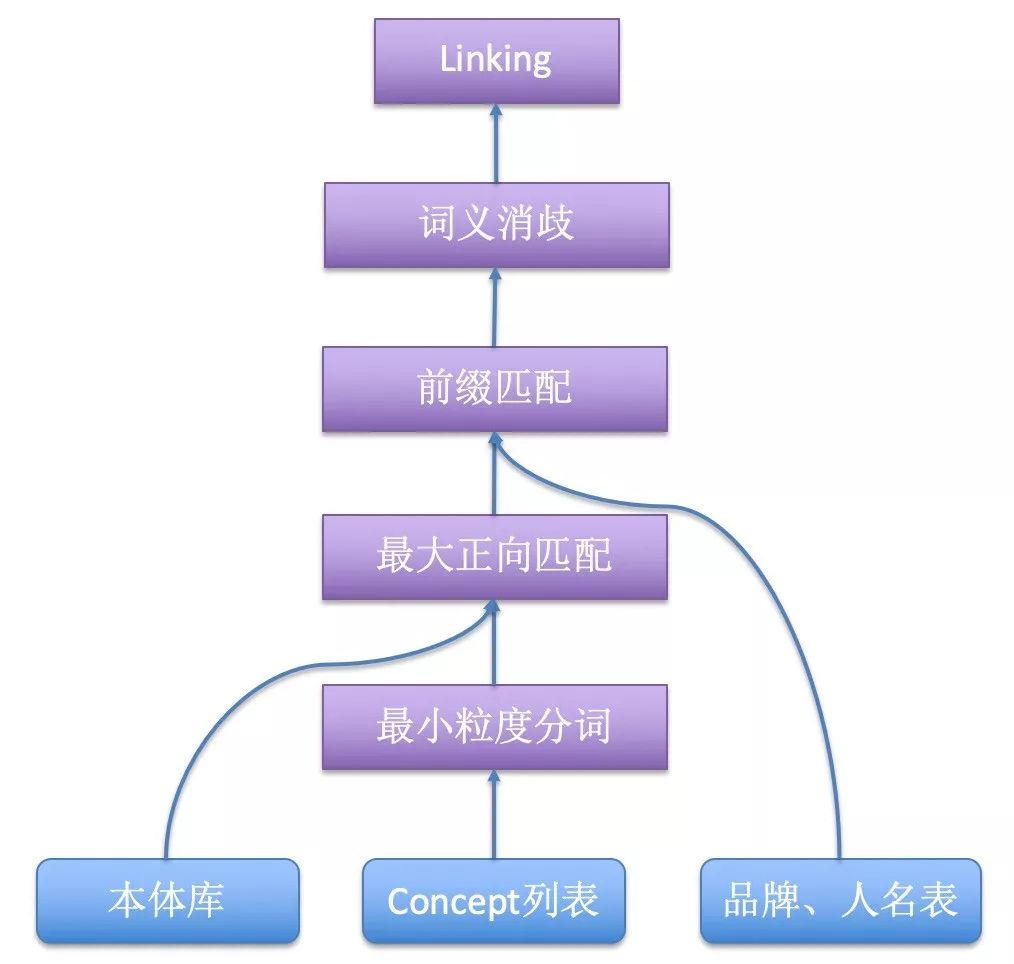 1) 基于词典的最大正向匹配及前缀匹配:给定一个concept,算法首先使用最小粒度分词,将concept切分成词,然后使用最大正向匹配算法,从左到右将分词后的concept的几个连续词与本体库的词典匹配,如果匹配上则返回本体词汇及类型(ID)。