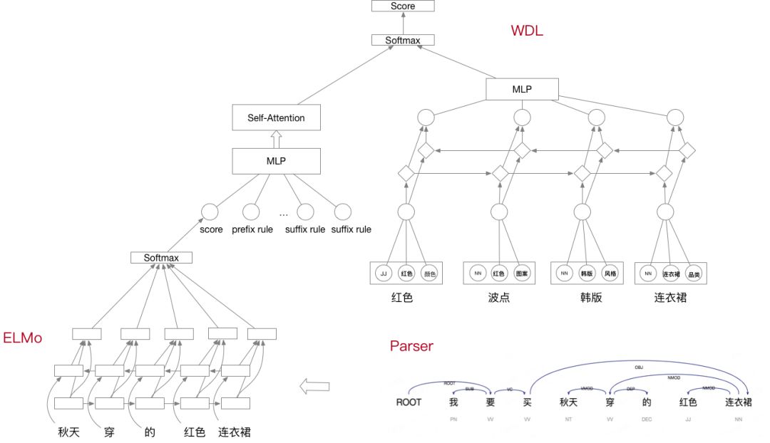 我们一方面结合一些简单的规则进行特征抽取,另一方面,利用现有的序列特征训练Wide&Deep model,来进行concept的合理性判断。在初始数据的处理方面,由于我们大部分的concept都是短文本,而query和title中大部分的term序列不符合正常的语序,我们还利用长文本的parsing infomation进行候选抽取和截断,训练了ELMo作为基础的语言模型,并在同样长度的gram内调整语序,来得到最佳的序列信息再给判别模型。